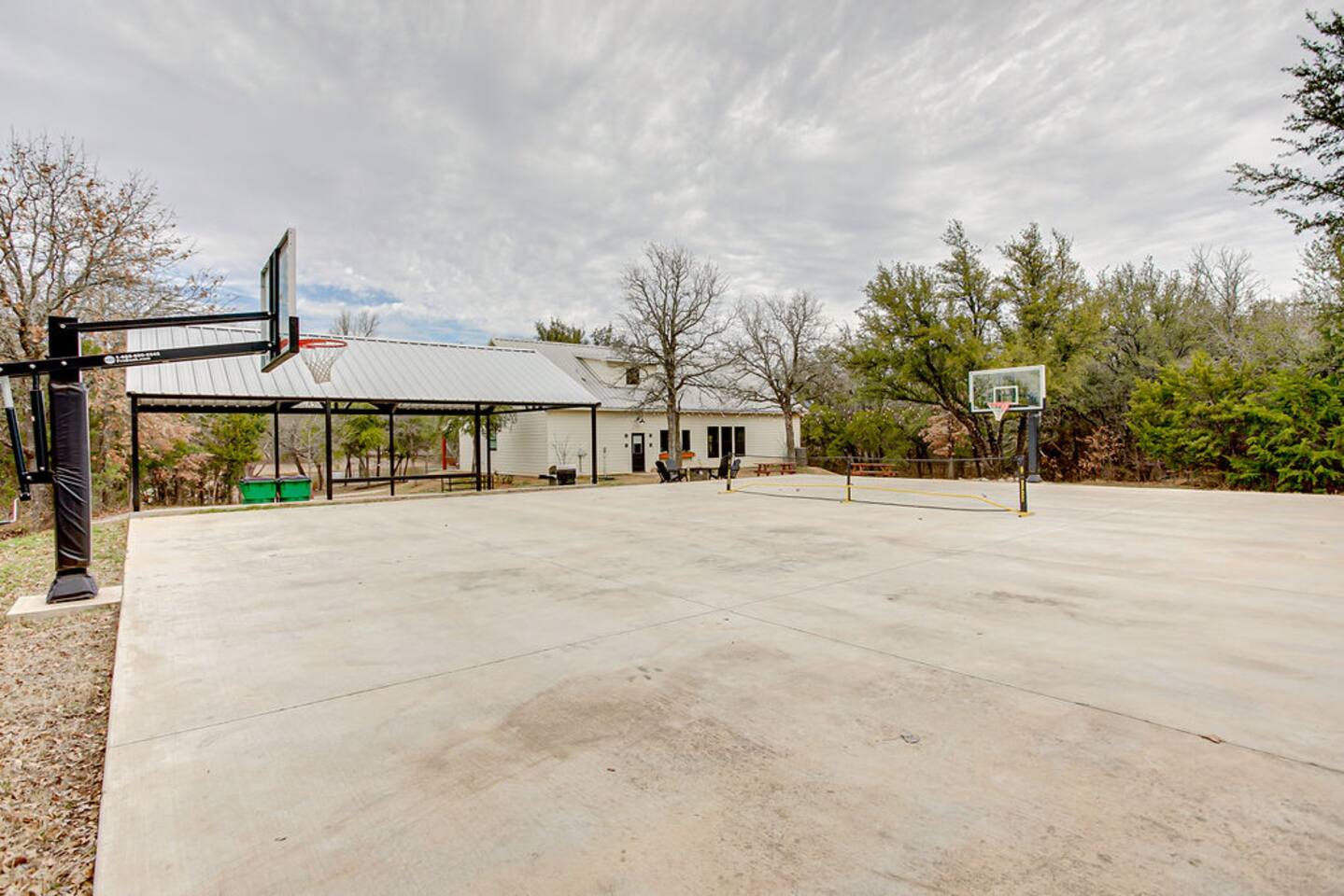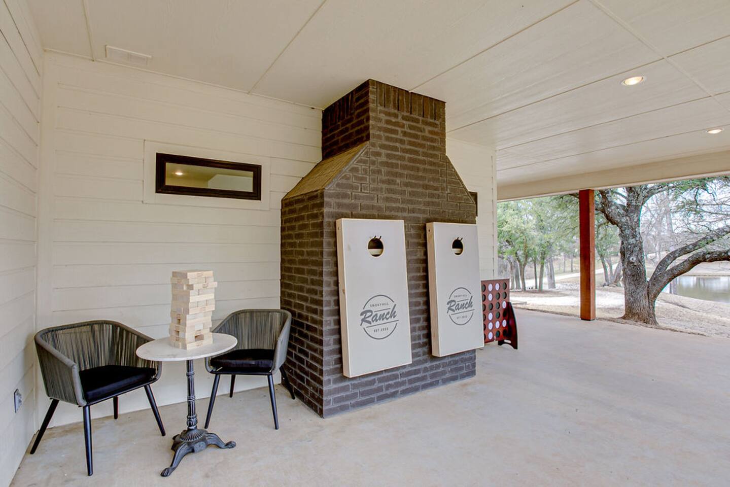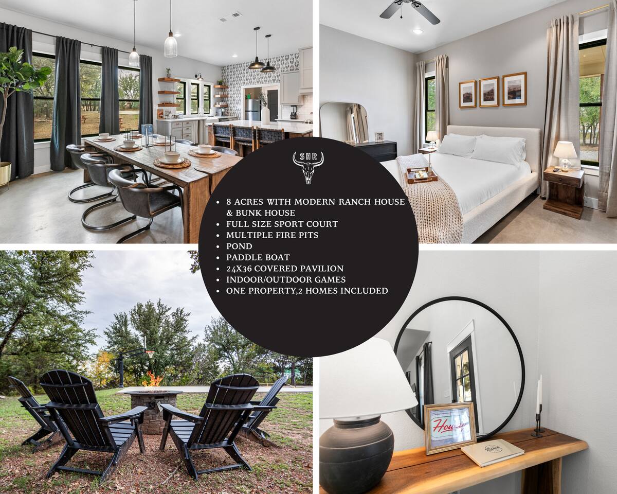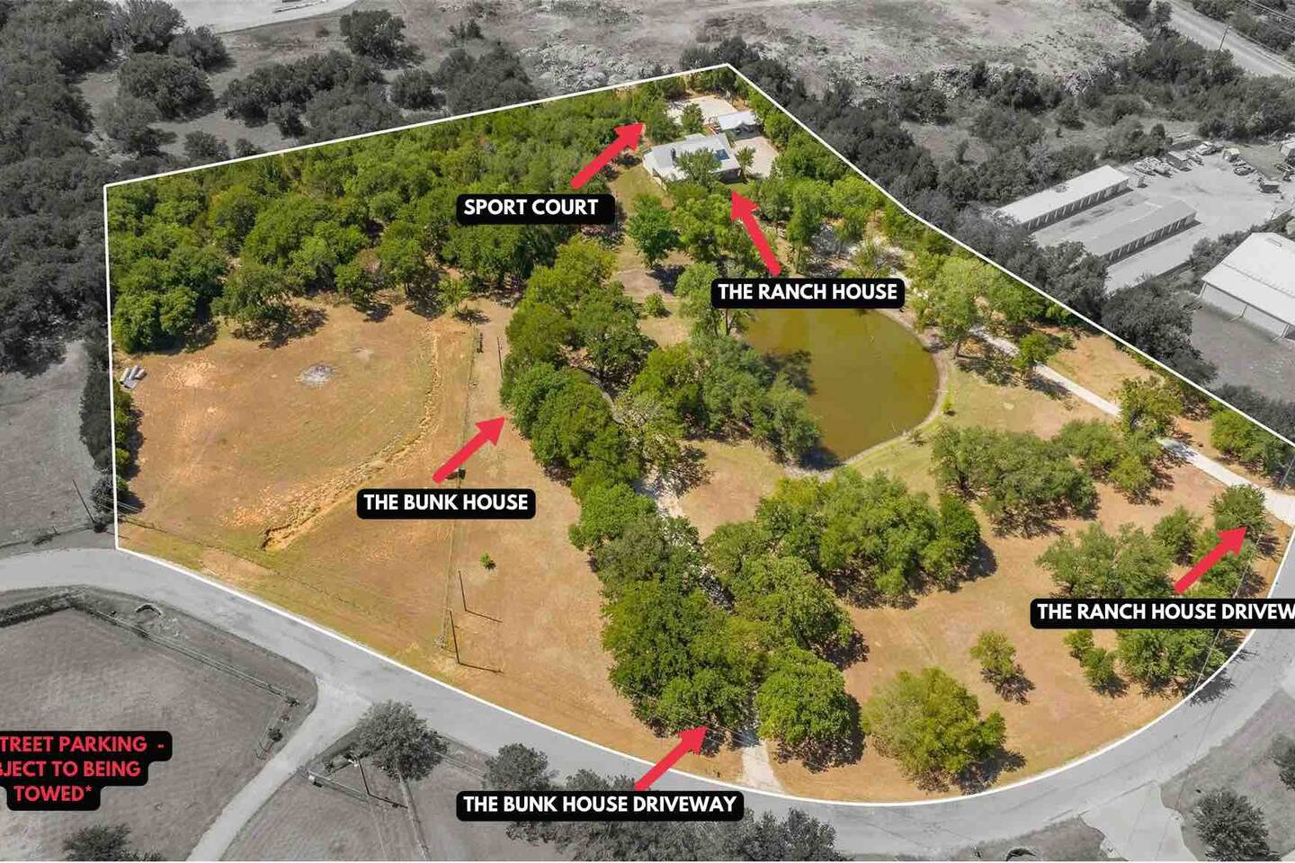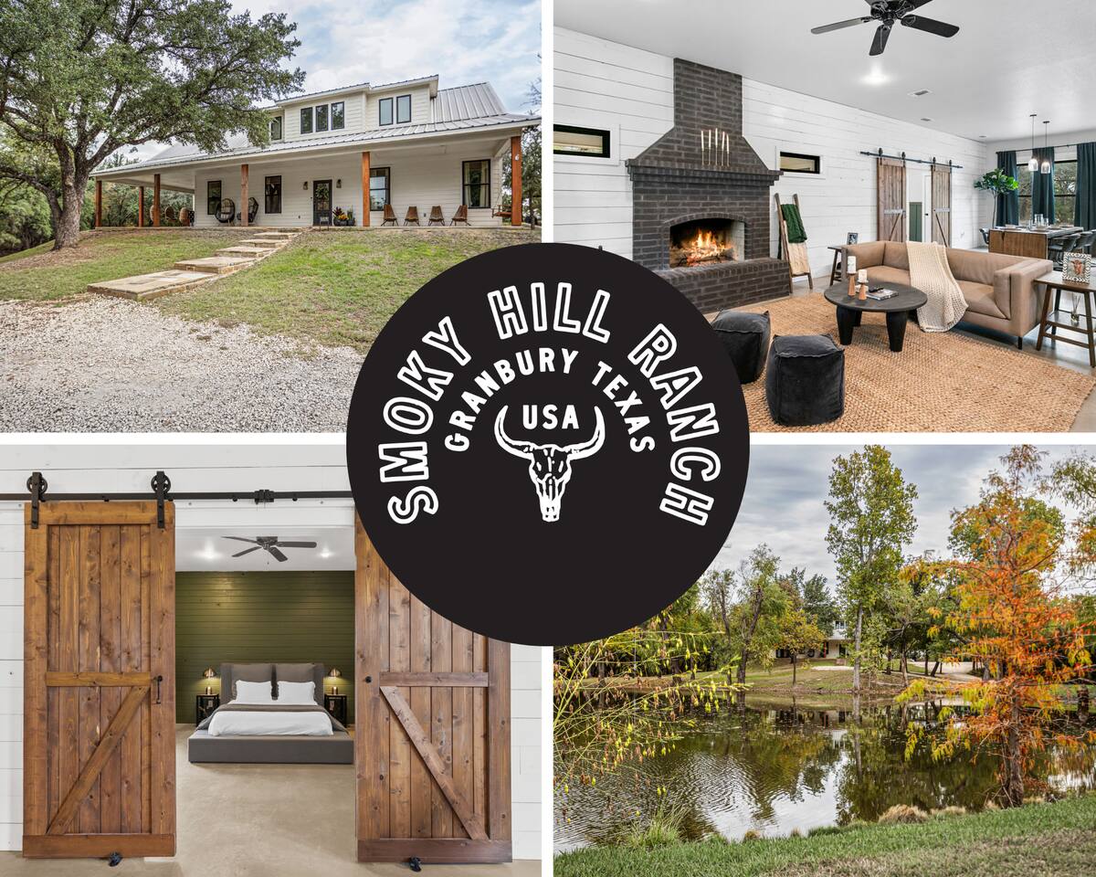 THE RANCH HOUSE: (Sleeps 13) The main ranch house is a modern open living concept and offers 4 bedrooms and 3 full bathrooms with a wrap around front porch with comfortable seating and games overlooking the pond. Kitchen: One of favorite spaces at Smoky Hill Ranch is the kitchen! The kitchen is open to the living area so large groups can enjoy being together. We spent a lot of time thinking about how to make this a comfortable and inviting space for our guests. We offer all the cooking wares and utensils you could need to prepare and serve a delicious meal for all of your guests: pots & pans, dinner service for 19 guests (plates, bowls, silverware, and kitchen basics). Living Area: The living area of the main ranch house is the perfect place for families and friends to relax and unwind. While cozying up on the sofa, you have the most amazing views of the wood burning fireplace and wrap around front porch that look out onto the pond. You can pull out a board game or turn your attention to the large 75 inch Smart TV with Youtube TV provided, or login to your own streaming services and pick up right where you left off on your favorite shows. Bedroom 1- The downstairs primary bedroom offers a king size bed, flat screen TV, office nook with wireless printer, large walk in closet, and an en suite bathroom with a soaking tub and walk in shower. Bedroom 2- The downstairs second bedroom offers a queen size bed, direct access to the wrap around porch, and a full en suite bathroom. Bedroom 3- The second upstairs bedroom offers two queen beds, flat screen TV, and a twin bed looking out towards the pond. Bedroom 4- The upstairs family room offers a queen bed, two twin beds, flat screen TV, and a Nintendo Switch for guests entertainment. THE BUNK HOUSE: (Sleeps 6) The bunk house offers two sets of bunk beds(full size bed on the bottoms and twin on top), kitchenette with full size refrigerator, 65 inch TV with streaming services and Youtube TV provided, beverage bar, washer/dryer, en suite bathroom with a walk in shower, and views looking out to the pond of Smoky Hill Ranch. OUTDOORS: The outdoor area of Smoky Hill Ranch is our favorite part for many reasons! Smoky Hill Ranch offers access to full size sport court with in ground adjustable basketball hoops, two separate fire pits to gather around, 24x36 covered pavilion, outdoor games including corn hole, oversized jenga, four across, a stocked pond for fishing, and outdoor dining tables. In the evenings or early morning you can sit outside and enjoy the peaceful, relaxing views of wildlife, take a hike or bike though miles of trails at the Acton Nature Center located less than a mile away (.5 miles). EVENTS: ALL EVENTS MUST BE APPROVED BY THE HOST BEFORE BOOKING.We're very willing to accommodate events or other requests such as fundraisers, baby showers, gender reveals, rehearsal dinners, birthday parties, etc. All events will be priced in addition to the nightly rate. Please reach out to the host for additional information on hosting events at Smoky Hill Ranch. The maximum number of guests allowed at the house is 19 unless otherwise approved. If you are looking to book any event for more than 19 people, please contact us for more information about pricing. AROUND SMOKY HILL: . A mile down the road, you'll find Acton Nature Center where you can take a hike or bike through miles of trails. We are very close to all the attractions that Granbury has to offer as well, only .9 miles from Revolver Brewing with events every Saturday, 5 miles from public boat ramps to play on Lake Granbury, 8 miles from Historic Granbury Square with dining/shopping/wineries, and 1 mile from FCS Paintball. Don't worry, you'll have a digital guidebook with all the details at your fingertips when you stay with us. We'll make sure of that so you won't miss out on anything Granbury has to offer! GENERAL: Free WiFi, Board Games ,Bluetooth Speaker, Poker Set, Flat Screen TV's with streaming service capabilities, Youtube TV, luxury white linens/towels, complimentary toiletries, trash bags, paper towels, hair dryer, iron/board,2 full washer/dryer central heating & A/C, high-chair, Pack N’ Play CLEANLINESS: We employ a local, high-level, professional cleaning team who understands the cleanliness standards we have set for our property. Together, we make certain our guests are able to settle in and feel confident in a sparkling clean home away from home. PARKING: There is two long gravel driveways leading both to The Ranch House and The Bunk House. You can park anywhere on both driveways, under the covered pavilion/carport, or for excess/overflow parking you may park on the acreage to the West of the property. NO STREET PARKING. SECURITY SYSTEM: We utilize a Ring doorbell and Ring Security Cameras for the safety of guests and Smoky Hill Ranch. The cameras are located on the outside corners of both homes and they will not be monitored, aside from check-in, during your stay unless an issue arises. Covering or disabling either of these devices, in any way, is strictly prohibited and will result in being removed from the property without a refund.