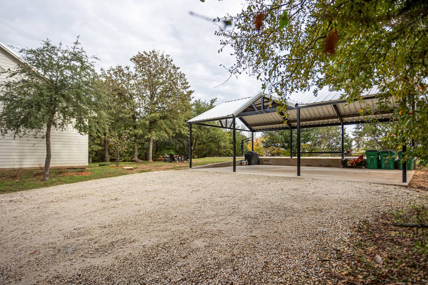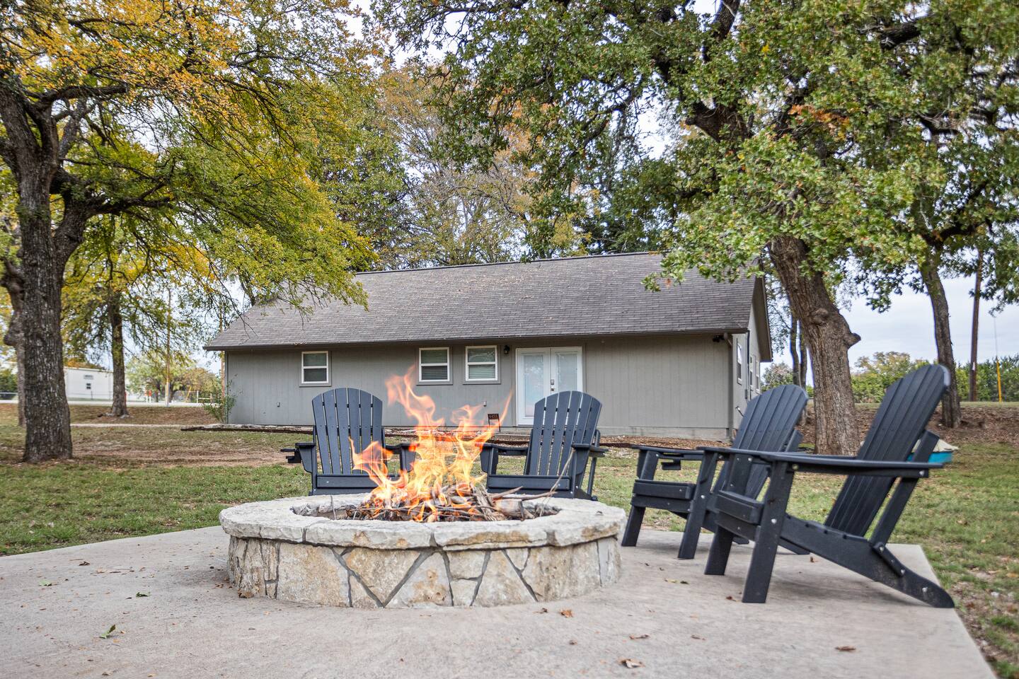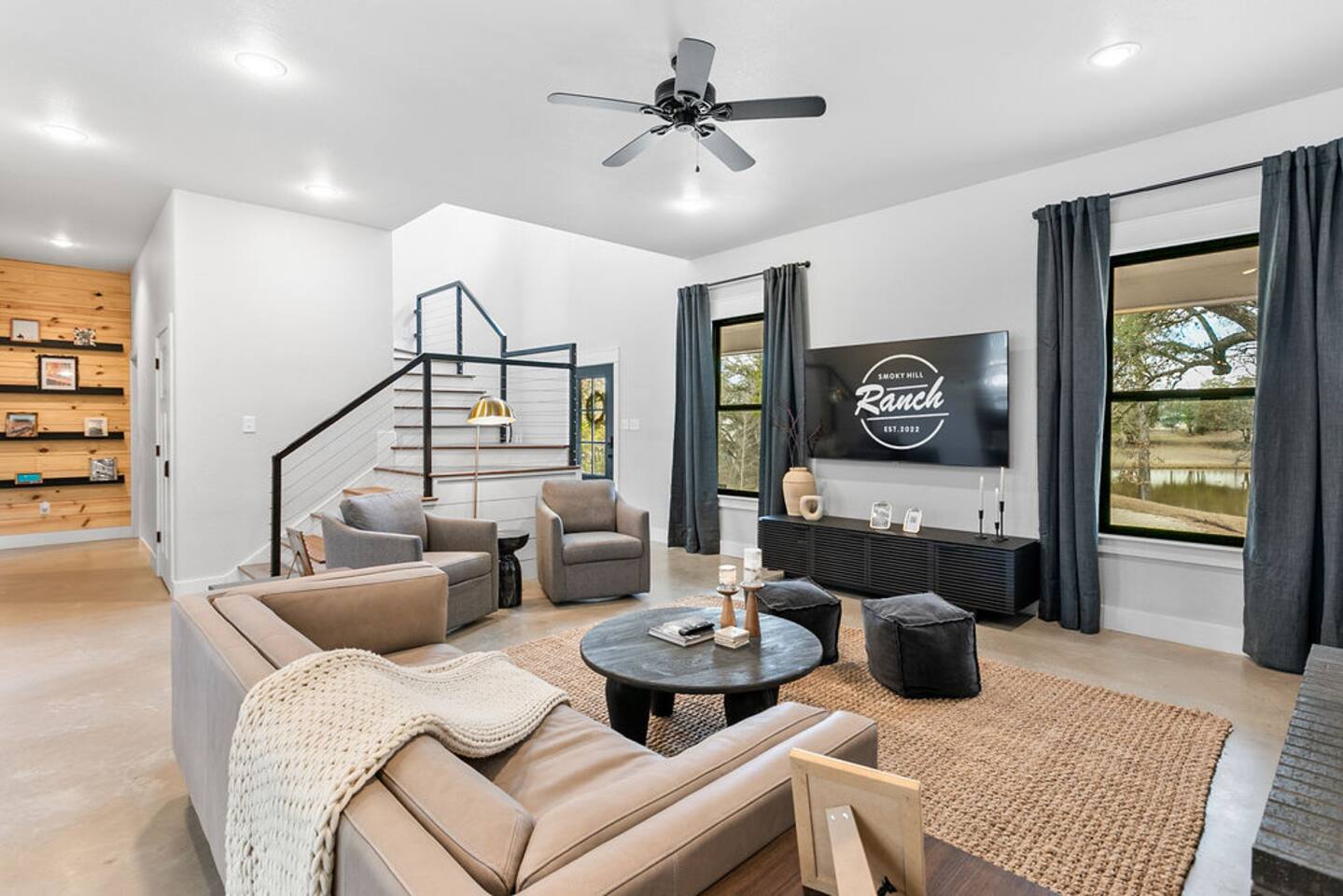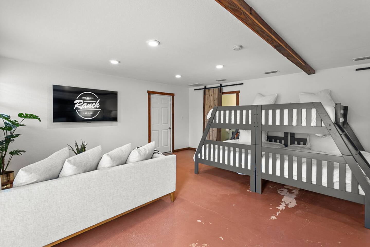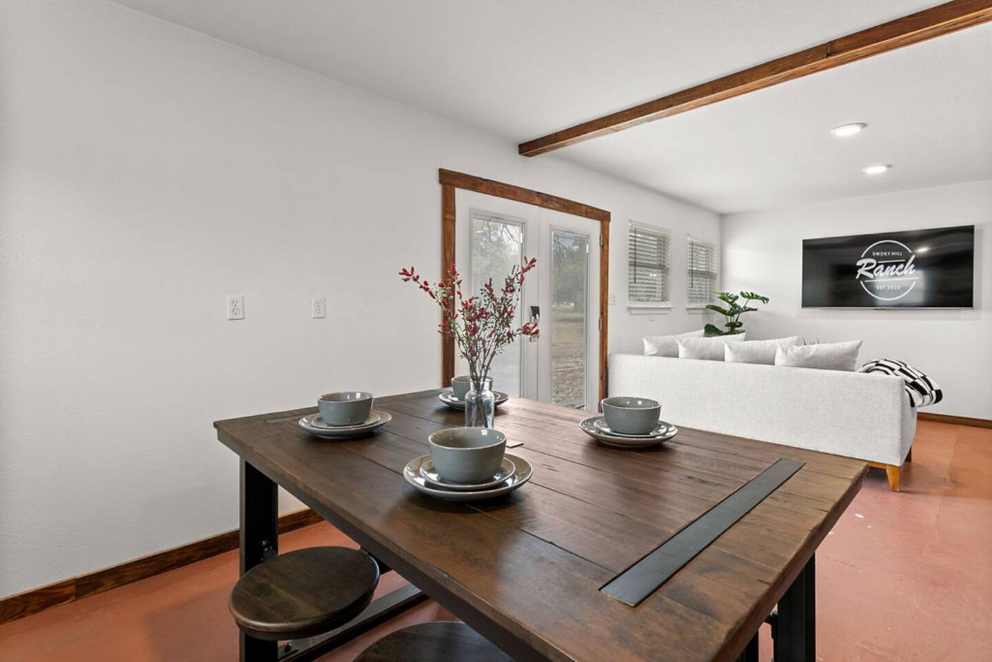 THE RANCH HOUSE: (Sleeps 13) The main ranch house is a modern open living concept and offers 4 bedrooms and 3 full bathrooms with a wrap around front porch with comfortable seating and games overlooking the pond. Kitchen: One of favorite spaces at Smoky Hill Ranch is the kitchen! The kitchen is open to the living area so large groups can enjoy being together. We spent a lot of time thinking about how to make this a comfortable and inviting space for our guests. We offer all the cooking wares and utensils you could need to prepare and serve a delicious meal for all of your guests: pots & pans, dinner service for 19 guests (plates, bowls, silverware, and kitchen basics). Living Area: The living area of the main ranch house is the perfect place for families and friends to relax and unwind. While cozying up on the sofa, you have the most amazing views of the wood burning fireplace and wrap around front porch that look out onto the pond. You can pull out a board game or turn your attention to the large 75 inch Smart TV with Youtube TV provided, or login to your own streaming services and pick up right where you left off on your favorite shows. Bedroom 1- The downstairs primary bedroom offers a king size bed, flat screen TV, office nook with wireless printer, large walk in closet, and an en suite bathroom with a soaking tub and walk in shower. Bedroom 2- The downstairs second bedroom offers a queen size bed, direct access to the wrap around porch, and a full en suite bathroom. Bedroom 3- The second upstairs bedroom offers two queen beds, flat screen TV, and a twin bed looking out towards the pond. Bedroom 4- The upstairs family room offers a queen bed, two twin beds, flat screen TV, and a Nintendo Switch for guests entertainment. THE BUNK HOUSE: (Sleeps 6) The bunk house offers two sets of bunk beds(full size bed on the bottoms and twin on top), kitchenette with full size refrigerator, 65 inch TV with streaming services and Youtube TV provided, beverage bar, washer/dryer, en suite bathroom with a walk in shower, and views looking out to the pond of Smoky Hill Ranch. OUTDOORS: The outdoor area of Smoky Hill Ranch is our favorite part for many reasons! Smoky Hill Ranch offers access to full size sport court with in ground adjustable basketball hoops, two separate fire pits to gather around, 24x36 covered pavilion, outdoor games including corn hole, oversized jenga, four across, a stocked pond for fishing, and outdoor dining tables. In the evenings or early morning you can sit outside and enjoy the peaceful, relaxing views of wildlife, take a hike or bike though miles of trails at the Acton Nature Center located less than a mile away (.5 miles). EVENTS: ALL EVENTS MUST BE APPROVED BY THE HOST BEFORE BOOKING.We're very willing to accommodate events or other requests such as fundraisers, baby showers, gender reveals, rehearsal dinners, birthday parties, etc. All events will be priced in addition to the nightly rate. Please reach out to the host for additional information on hosting events at Smoky Hill Ranch. The maximum number of guests allowed at the house is 19 unless otherwise approved. If you are looking to book any event for more than 19 people, please contact us for more information about pricing. AROUND SMOKY HILL: . A mile down the road, you'll find Acton Nature Center where you can take a hike or bike through miles of trails. We are very close to all the attractions that Granbury has to offer as well, only .9 miles from Revolver Brewing with events every Saturday, 5 miles from public boat ramps to play on Lake Granbury, 8 miles from Historic Granbury Square with dining/shopping/wineries, and 1 mile from FCS Paintball. Don't worry, you'll have a digital guidebook with all the details at your fingertips when you stay with us. We'll make sure of that so you won't miss out on anything Granbury has to offer! GENERAL: Free WiFi, Board Games ,Bluetooth Speaker, Poker Set, Flat Screen TV's with streaming service capabilities, Youtube TV, luxury white linens/towels, complimentary toiletries, trash bags, paper towels, hair dryer, iron/board,2 full washer/dryer central heating & A/C, high-chair, Pack N’ Play CLEANLINESS: We employ a local, high-level, professional cleaning team who understands the cleanliness standards we have set for our property. Together, we make certain our guests are able to settle in and feel confident in a sparkling clean home away from home. PARKING: There is two long gravel driveways leading both to The Ranch House and The Bunk House. You can park anywhere on both driveways, under the covered pavilion/carport, or for excess/overflow parking you may park on the acreage to the West of the property. NO STREET PARKING. SECURITY SYSTEM: We utilize a Ring doorbell and Ring Security Cameras for the safety of guests and Smoky Hill Ranch. The cameras are located on the outside corners of both homes and they will not be monitored, aside from check-in, during your stay unless an issue arises. Covering or disabling either of these devices, in any way, is strictly prohibited and will result in being removed from the property without a refund.